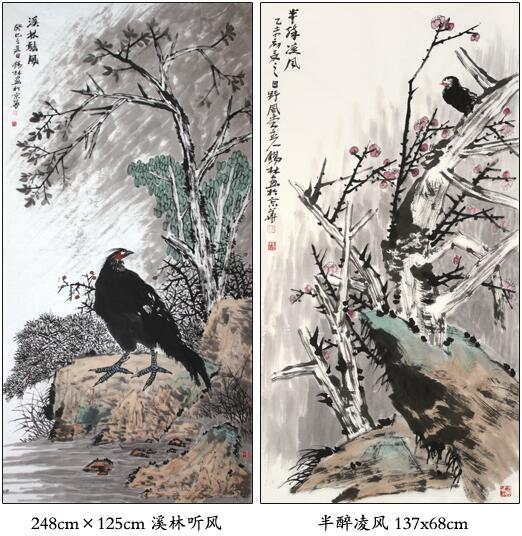潘锡林的花鸟画走的是大写意一路,也是花鸟画中最能体现画家本质功力和对章法布局要求最高的一种。对黑白韬略的悉心领悟和自由生化,使得潘锡林的大写意花鸟在主次把握、虚实处理、繁简对比上几近得心应手、成竹在胸的境地,而这也正是他的画作于丰厚华滋里别具灵动透亮、气韵豪纵的机缘。而对用墨之道、用色之法的苦心探求和研磨锤炼,使潘锡林的花鸟画墨色淡雅而不失厚重,色彩华美而绝不艳俗。大写意花鸟强调色墨混用,墨不碍色、色不碍墨,以墨代色、以色辅墨,如此的色墨呼应、墨色共滋恰是潘锡林花鸟画的一个重要气象。