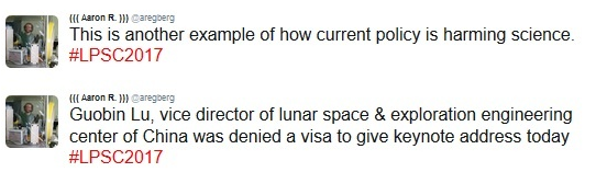 这是另一个政治损害科学的例子。中国探月与航天工程中心副主任于国斌遭美国拒签,他本来今天将做主题演讲。