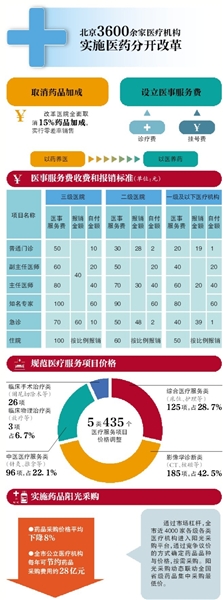 《北京市医药分开综合改革实施方案》昨日正式发布。4月8日起,北京所有公立医疗机构都将取消挂号费、诊疗费,取消药品加成,设立医事服务费。同时,435项医疗服务价格将规范调整。