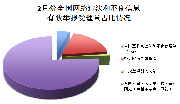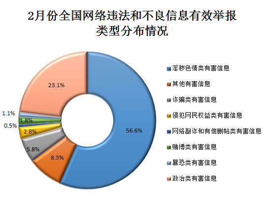 2月份,全国各地网信办、各网站举报部门多措并举,大力推进网络举报工作,受理违法和不良信息有效举报255.7万件,同比增长约35.1%,环比下降5.8%。