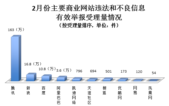 腾讯、新浪、百度、阿里巴巴等主要商业网站受理违法和不良信息有效举报194.4万件,处置或向执法部门转交188.1万件。其中,腾讯受理有效举报约163万件(微信85.1万件、QQ71.5万件、腾讯网4.1万件、新闻1.6万件、微博6891件),新浪受理有效举报16.8万件(新浪微博15.1万件、新浪网1.7万件),百度受理有效举报10.8万件,阿里巴巴受理有效举报3.6万件,凯迪网络受理有效举报796件,天涯社区受理有效举报694件,搜狐网受理有效举报501件,优酷网受理有效举报173件,网易网受理有效举报120件,凤凰网受理有效举报54件。