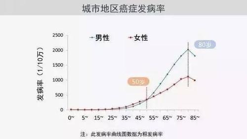 第一:据统计,癌症从40岁之后发病率快速提升,80岁时达到高峰。