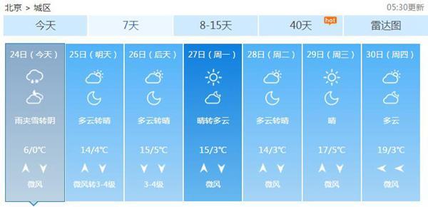 北京雨雪下午渐止 周末转晴气温升至15℃