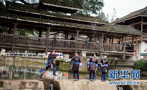 侗族姑娘在风雨桥前游玩。新华网发(吴德军摄)
