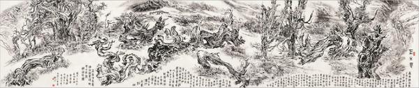 张仃所用的“线” ,不仅仅是用毛笔来勾勒自然的客观形态,他的运笔遒劲从容、意态盎然,开合之间融入了篆书的意象与气韵,所以他的线条有书法的韵味和功底,而这种功底使他的“对景写生”具有中国艺术的高古苍浑和缈缈的意境。在绘画题材上,张仃更是将写实山水加以升华,把人文关怀、家园意识、英雄史诗和历史沧桑带入山水画,开辟了中国山水画艺术的新境界,焦墨山水得以在中国画系统中斐然成章。