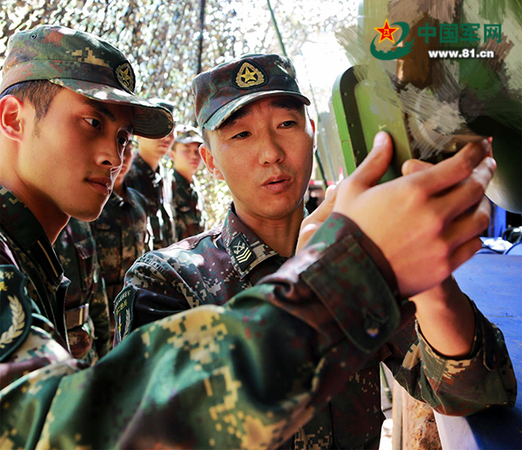 火箭军某旅一级军士长、技师周述雄:多次被评为“装备管理先进个人”和“一级操作号手”,是万能“装备通”和导弹“兵专家”。图为周述雄正在传帮带。
