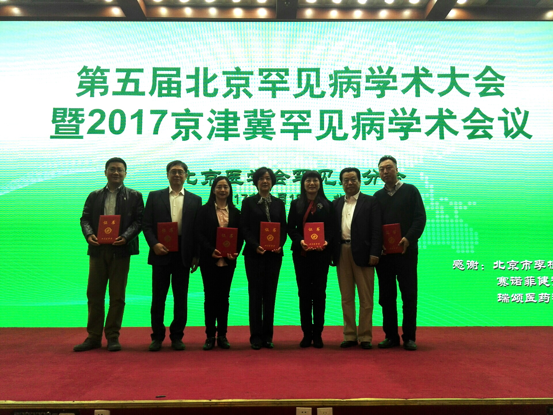 北京医学会罕见病分会成立了六个学组,金大鹏会长(右二)为六位组长颁发聘书。