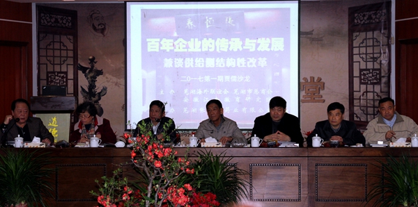 与会的企业家们就本期沙龙主题“百年企业的传承与发展兼谈供给侧结构性改革”,结合自身企业发展的优势、劣势以及当前面临的困境和机遇进行了深入的探讨和交流。张恒春药业有限公司董事长王伟杰认为,百年企业的基业长存之路不仅是对优秀企业文化的传承,更要有对观念、机制、技术等方面的创新。芜湖耿福兴餐饮管理有限公司总经理高述红、华亿集团副总裁张靖、芜湖金隆兴董事长周刚等分别进行了发言,畅谈企业未来发展之路。