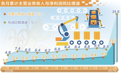 3月27日,国家统计局公布的工业企业财务数据显示,2017年1—2月份,规模以上工业企业利润总额同比增长31.5%,增速比上年12月份加快29.2个百分点,比上年全年加快23个百分点。
