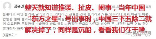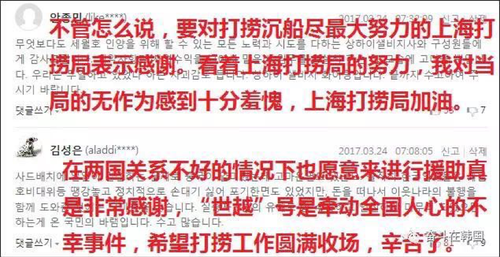 在网络上,多数韩国网友理性感激中国的援手。一位网友称“在两国关系不好的情况下也愿意来进行援助真是非常感谢,‘世越’号是牵动全国人心的不幸事件,希望打捞工作圆满收场,辛苦了?!?/p>