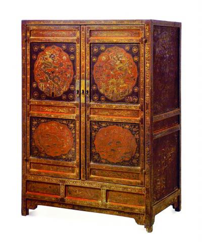 又如明中期朱漆描金云龙纹五屉橱(又名“五屉桌”),其高88厘米,长72.5厘米,宽46厘米,造型为橱顶带拦水线,冰盘沿;下部直腿圆角压边线,带侧脚收分,横枨为剑脊棱压边线;橱的前后都设有挂角牙子,腿间有拱形牙条,正面分两层设5个抽屉(已缺失)。此橱为杉木制胎,披厚灰,灰色发白,附着力很强,似为鹿角霜,通体髹朱漆,描金满绘云龙纹。龙鳞用竹签划理,黑漆点睛,龙鳍、云纹填黑彩。其眼睛横列,吻部细长,具有明代中期的风格。此橱虽无明宫款识(明代中期的宫廷家具多无款识),但从造型、漆色,特别是从纹饰上看,无疑具明中期家具的风格,并有由尚单色向尚五彩转变时期的工艺特点,约在明成化至正德年间制作,为我们了解明代中期宫廷家具的制作风格以及抽屉橱的演变提供了宝贵实物资料。