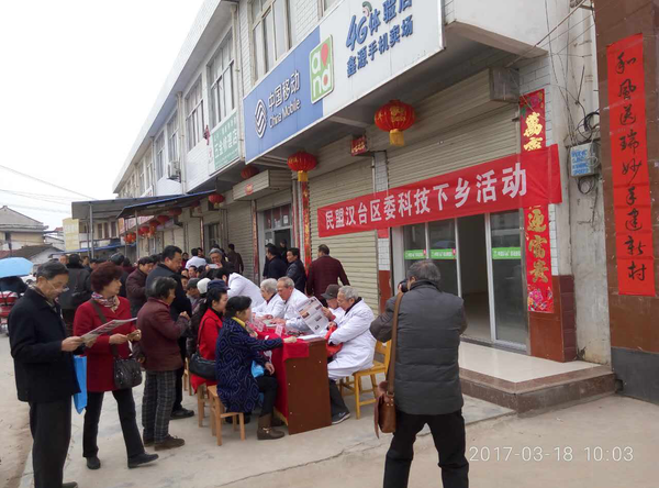 3月18日,民盟汉台区委组织农业、卫生、法律届的盟员共20人在汉台区汉王镇开展了科技下乡活动。