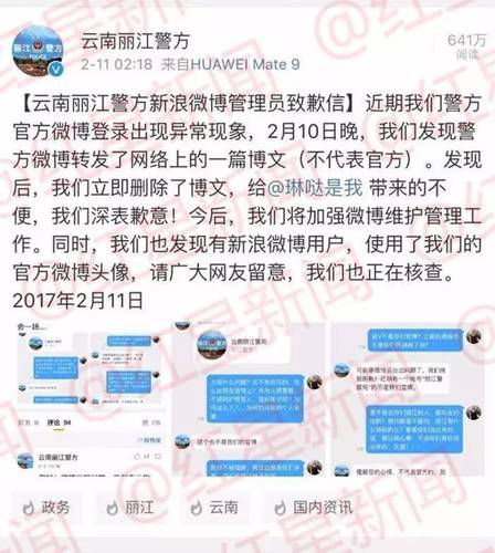2月11日凌晨,丽江警方发布致歉信,称当时官微出现异常情况,并删除了相关内容。当天晚上7时21分,丽江警方再次发声,称是丽江市公安局宣传民警在浏览网络文章时误发,并对涉事民警给予行政记过处分?!罢馐欠贪?,是诬陷?!毙《怠?/p>