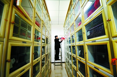 魏童从骨灰寄存柜中取出骨灰。八宝山殡仪馆提供骨灰免费寄存服务,很多逝者火化后的骨灰并不马上取走,数百个寄存柜成为逝者暂时的安置所。