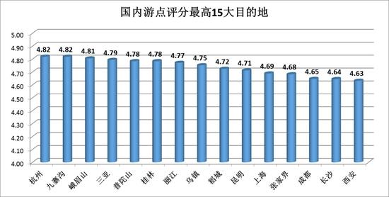 国内众多旅游城市和目的地中,哪些地方的游客点评分更高?报告发布了“国内游点评分最高15大目的地”,依次是:杭州、九寨沟、峨眉山、三亚、普陀山、桂林、丽江、乌镇、稻城、昆明、上海、张家界、成都、长沙、西安。其中,杭州以4.82分位居第1名。