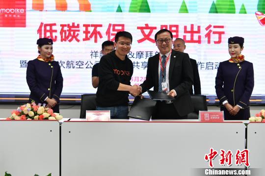 中新网昆明3月28日电 (记者 史广林)云南祥鹏航空责任公司与智能共享单车平台——摩拜单车28日在昆明签署战略合作协议,打造国内首个航空企业与智能共享单车在空地联运方面的合作示范和应用。