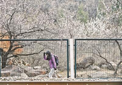 随着北京入春,居庸关的山花也进入了花期。昨日上午,北京青年报记者来到花海所处的铁路路段——京包铁路59公里至61公里之间。可以看到,山桃花已经开放,而山杏花还未完全开放。但这并没有阻挡摄影爱好者的热情,向山上望去,不时有人从树林中冒出头,伸出摄影器材的“长枪短炮”。为了拍一张列车穿过花海的照片,很多游客甚至进入铁路轨道,这种行为每天都在上演。