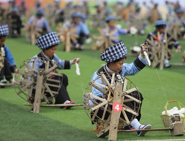 当日,在贵州省望谟县民族中学内,来自望谟县的331名布依族绣娘同时用纺线车纺线,成功挑战吉尼斯世界纪录。此次挑战选手年龄最大的88岁,年龄最小的40岁。新华社发