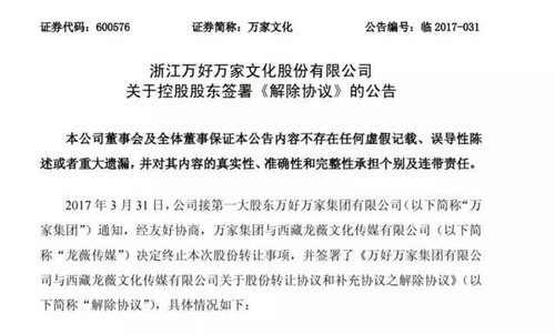昨日(3月31日)晚间,万家文化发布公告称,经友好协商,万家集团与龙薇传媒决定终止本次股份转让事项,并签署解除协议:双方约定互不追究责任,此前龙薇传媒预付的2.5亿元定金也原路退回。