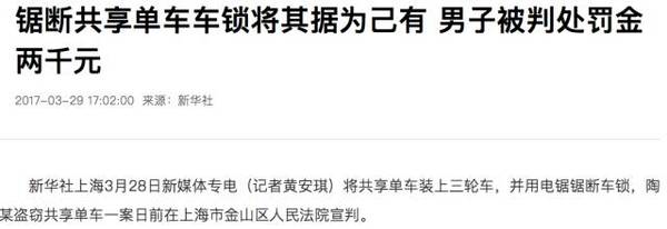 据悉,2016年12月25日12时30分许,陶某骑三轮车至停车地点,将该共享单车装车后运其暂住地,并使用电锯锯断车锁,以方便自己使用?!岸际且蛭乙皇碧靶?,看到这辆单车在路上放了半个多月,就想偷回家自己用?!碧漳潮硎荆暗笔贝嬖诮男倚睦?,现在才意识到自己的行为是错误的?!?/p>