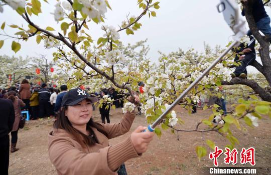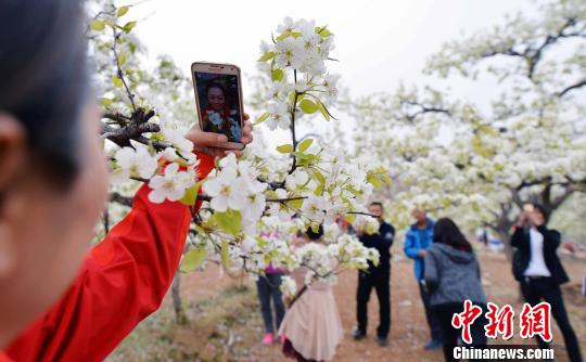 初春时节,河北省迁西县漫山遍野开满了鲜花,图为来自京津的游客赏花自拍。付文昊 摄