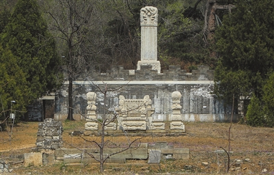 由于思陵未对游人开放,因此记者无法进入园内了解情况。但站在围墙外面的高地,则可以直接看到在白色墓碑前的地上,立有石五供。其中,居中的香炉和最两侧的花瓶没有出现明显的位移,但在两者中间的一对烛台除底座外,上方是缺失状态,与此前微博网友发布的图片一致。