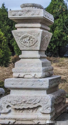 从吴晓平所发的“失踪”前照片可以看到,在石五供居中的香炉两侧,放有两个烛台。烛台加上底座,高度与香炉几乎持平,但比最外侧的两供略低。烛台中间细于上下两端,四面刻有人物和花草的浮雕。