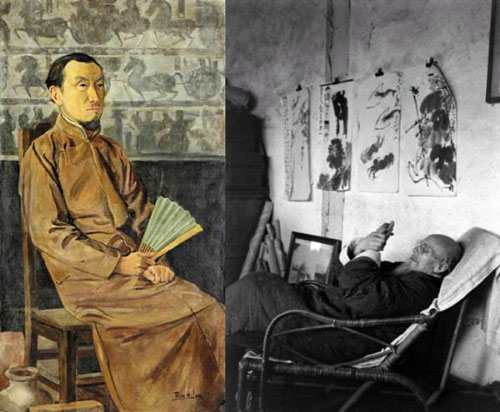 李毅士一九二○年绘油画《陈师曾像》,背景衬以画像砖、古陶等。齐白石晚年在家中留影,墙上悬挂其作。