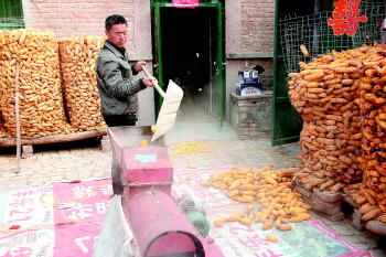 邵新运正给玉米脱粒。记者 赵念东(资料图)