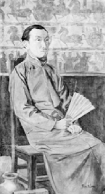 李毅士一九二○年绘油画《陈师曾像》,背景衬以画像砖、古陶等