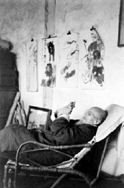 齐白石晚年在家中留影,墙上悬挂其作。