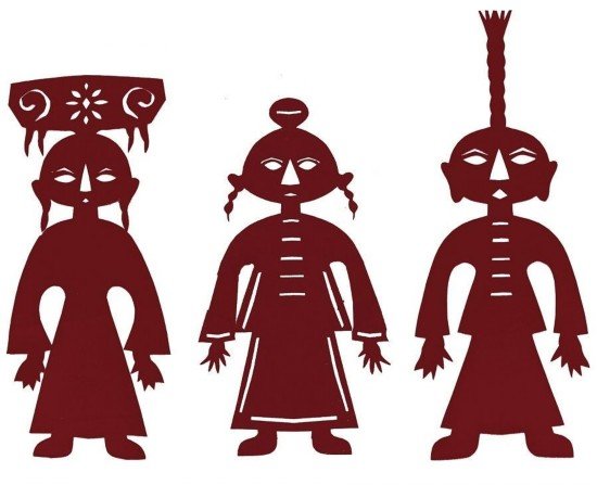 由于剪纸材料特异,必然导致剪纸造型的特异,树皮、树叶、鱼皮、布帛等材料远不如纸张薄、匀、软、韧,所以剪刻的线条不可纤细,追求粗犷。因是用来装饰衣服、枕具甚至屋、船,欣赏者距离较远,以线条粗犷最为醒目。所以动物均为正侧面、人物为正面,以突出特征,甚至动物、人物不剪出鼻、眼、口,身上无纹饰,追求剪影效果,都是为突出整体效果,这与画论中说的“远人无目、远树无枝”不谋而合。