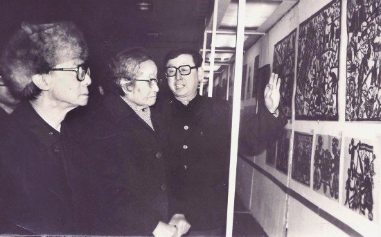 1987年,长白山区满族民间剪纸刺绣作品进北京举办专题展览的开幕式上,爱新觉罗·溥杰、老舍夫人胡絜青一同欣赏满族剪纸作品