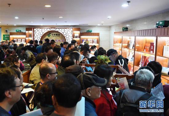 4月9日,集邮爱好者在展示《红山文化玉器》特种邮票