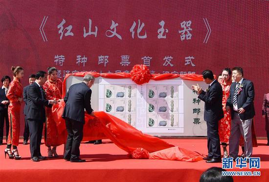 当日,《红山文化玉器》特种邮票全国首发式在辽宁省朝阳市建平县牛河梁遗址博物馆举行。
