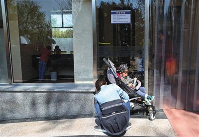 4月1日,北京动物园,一位年轻妈妈带着孩子在公共卫生间门口。动物园由于小游客较多,经?;嵊屑页ご⒆由喜匏?/p>