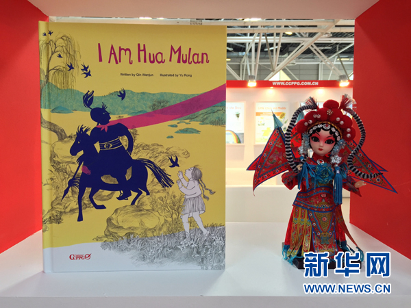 4月5日,在意大利博洛尼亚童书展中国展台上摆放的绘本《我是花木兰》。新华网发