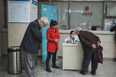 北京大学肿瘤医院,一位老年市民在咨询医药改革新变化。