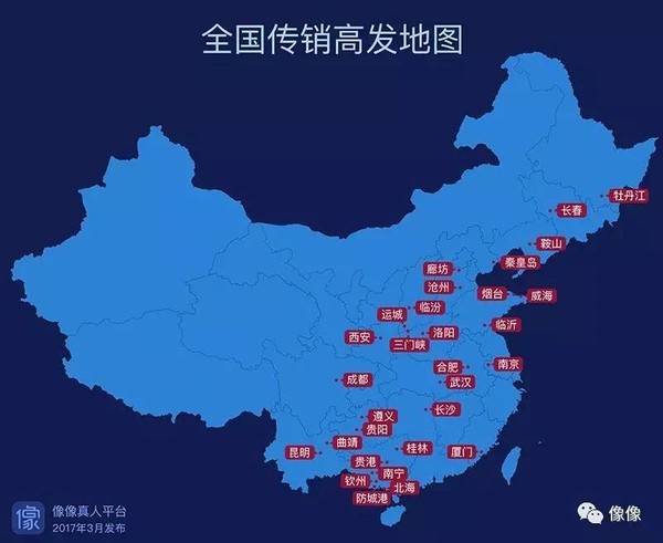 3月23日,某社交平台根据网友的举报线索,在其官方微信上发布了一张《全国传销高发地图》。根据地图显示,全国有30个城市被列为“传销高发地”。