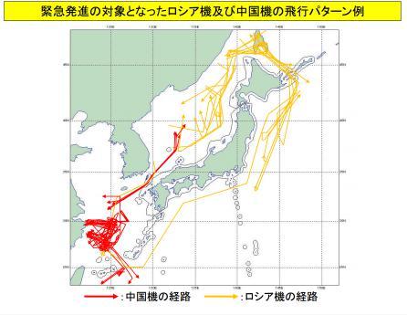 紧急起飞对象俄罗斯军机和中国军机的飞行路线图(红色为中国,黄色为俄罗斯)