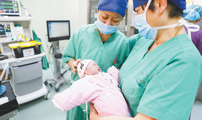 一名SH2D1A基因致病性变异携带者近日在上海生下一名健康女婴。借助胚胎植入诊断技术,女婴的后代将告别发病率只有十万分之一至五万分之一的罕见病——噬血细胞综合征。图为医护人员正抱着这名刚降生的女婴。