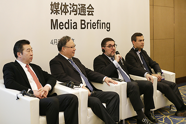 诺华肿瘤全球CEO Bruno Strigini回答媒体提问。新华网杨锘摄