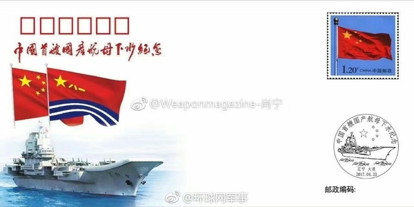 就在上一个周末,航母下水首日封图片刷遍很多朋友圈和微博,首日封左上角赫然红色书法“中国首艘国产航母下水纪念”,然后是鲜艳的国旗和海军军旗,右下的印戳显示时间和地点“中国 大连 2017.04.23”。从图片研判,不像是业余网友的PS之作,但左下角的航母图显然不是现场图,一时之间,真假莫辨。但它还是引发爱国军迷的振奋之情,掀起新一波关注国产航母下水的高潮。