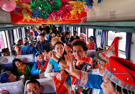 新疆56个民族代表同乘“民族团结一家亲号”列车,车厢似欢乐的海洋。吴卓胜摄