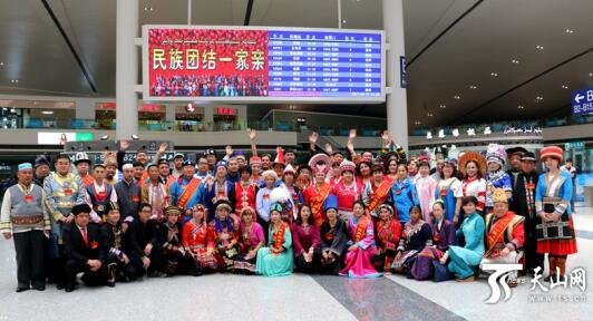 4月11日,新疆维吾尔自治区各民族团结进步座谈会在乌鲁木齐召开,来自全疆各地的120多位各族各界代表、民族团结进步模范代表齐聚一堂,共叙民族团结佳话。图为56个民族的代表在乌鲁木齐火车站相聚。孙健摄