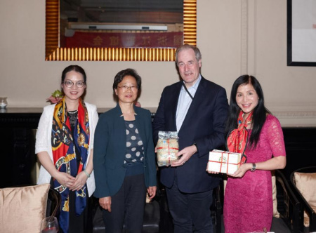 梁黎明副省长向麦克·贝茨勋爵伉俪赠送家乡名茶和浙江省资料。
