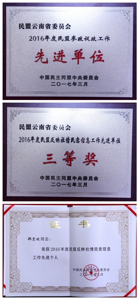 刚刚结束的民盟参政议政工作会议传来喜讯,2016年度民盟云南省委参政议政工作在全盟的考核评比排名中名列前茅,荣获“2016年度民盟参政议政工作先进单位”,“2016年度民盟反映社情民意信息工作先进单位三等奖”;盟省委参政议政部副部长郑宏斌荣获“2016年度民盟反映社情民意信息工作先进个人”。受到了民盟中央的表彰。