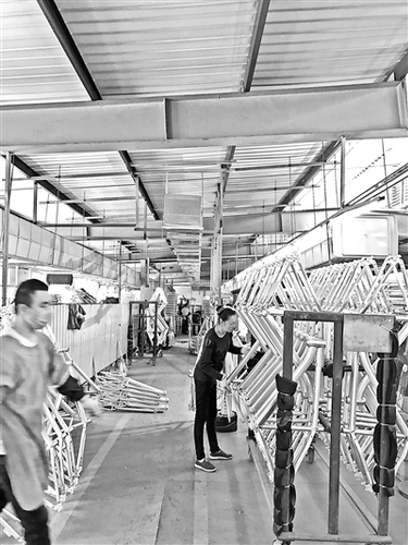 厂房内正在为摩拜单车生产配件,车间负责人孟先生告诉北青报记者,共享单车的订单没有用铁架的,都是选择铝镁合金等高档配件。例如铝合金6061管材,加入了硅和镁,强度好,抗腐蚀性强。为了保证质量,共享单车的质检员和组装厂的质检员都定期来厂抽查,主要检查产品的物理性能指标,以及尺寸精度等项目。熟练焊工工资15000元/月,需要50-60人,倒班加班开工满负荷运营。