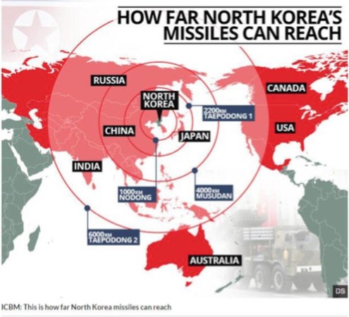 报道称,距离朝鲜800英里处的日本极其危险;美国的阿拉斯加到朝鲜的距离为3700英里,也被覆盖;俄罗斯的莫斯科、伊朗的德黑兰和阿联酋的迪拜大约在4000英里处,处在被打击范围的边缘;文章庆幸地说,英国距离朝鲜达5200英里,这个距离使英国不必为遭受朝鲜的核攻击感到忧虑。