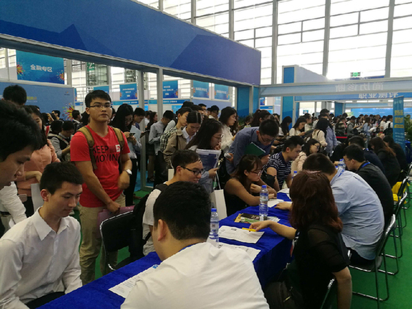 现场最火爆的还是2号展馆海归人才专馆,馆内近250个展位、来自全国超过200家知名企业面向海归英才开放逾1600个工作岗位。